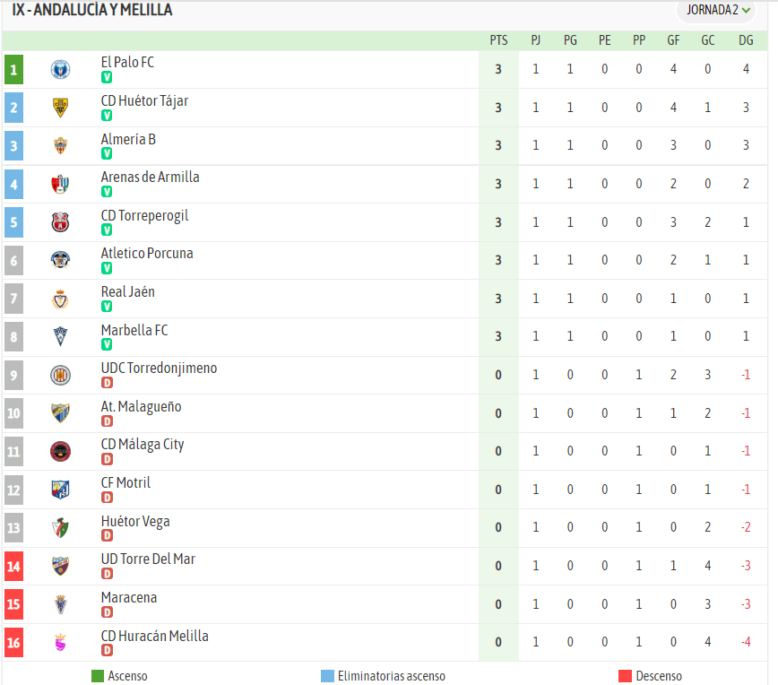 - El U.D Almería »B» (7º), C.D Huétor Vega (6º), y Atlético Malagueño (5º) tienen opciones reales de clasificarse al play-offs, los tres únicos que aún pueden soñar con ascender o rozar la liguilla. Recordamos que solo puede entrar al play-off desde el 5º hasta el 2º siendo el primero el que pasa directo. El C.D Huétor Vega ya estarían clasificado para la Copa RFAF.